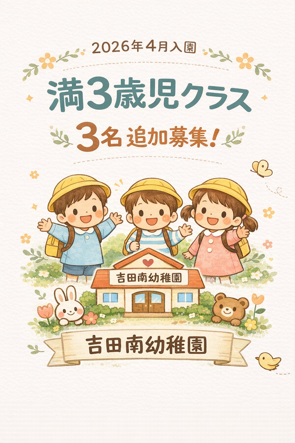 満3歳児クラス 追加募集♪ 2026.01.30 2026年4月からの在園枠について追加募集のお知らせです♪ 対象は【満3歳児クラス(1号認定)】👉 2023年4月2日 ~ 2024年4月1日 生まれのお子さん 転園や転居等で入園を検討されている方。まずは園(099-294-3730)へお問い合わせ下さい♪ ※入園願書を提出する場合、必ず【園見学】をお願いしております。 ※追加募集は埋まり次第、終了とさせていただきます。予めご了承ください。